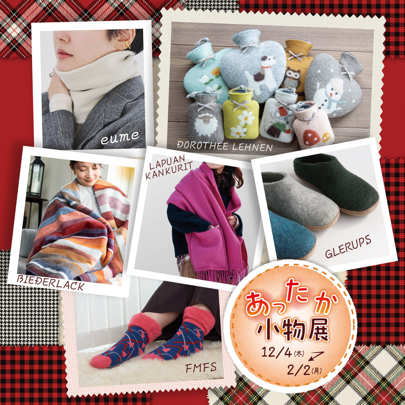 2025年12月4日(木)~2026年2月2日(月) あったか小物展を開催します。毎日が少し楽しくなる小さなぬくもりを探しにいらしてください。