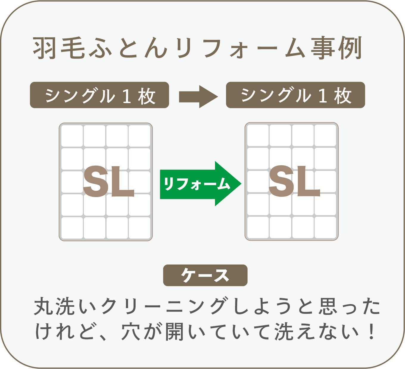 【事例】羽毛ふとんリフォーム【シングル1枚→シングル1枚・丸洗いクリーニング出来ない場合】