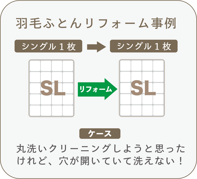 【事例】羽毛ふとんリフォーム【シングル1枚→シングル1枚・丸洗いクリーニング出来ない場合】