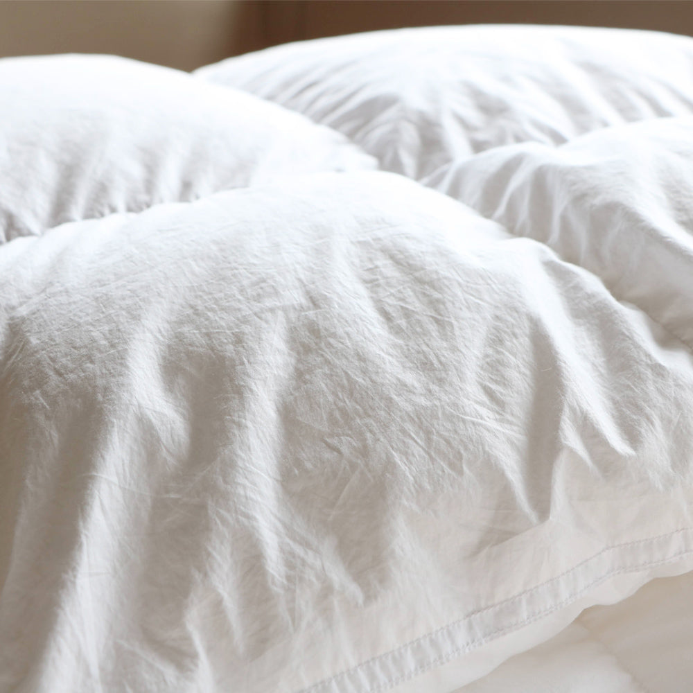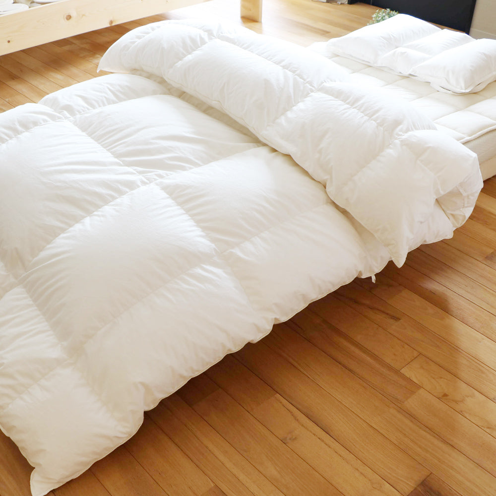側生地の汚れや痛みを防ぐため、カバーを掛けて使用してください。カバーはこまめに洗う事が大切です。月に1~2回カバーを掛けたまま陰干しします。干すことで湿気を取り保温性やかさ高、弾力性を高めます。殺菌効果を考えて直射日光に当てる場合は長時間の干しっ放しは避けましょう。取り込む際にたたくのは厳禁です。ダウンを痛めてしまいます。保管する際は湿気や熱を逃がしてから保管してください。ビニールケースなど通気性の悪い物は避けてください。ふとん圧縮袋はかさが戻らなくなるので使用しないでください。収納時は羽毛ふとんが一番上になるように収納しましょう。