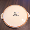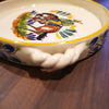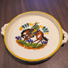 こちらは、お皿の淵と周りにも絵付けされ持ち手部分にねじれの装飾が施された大き目のお皿です。大きさは直径約21cm、高さ3.5cmです。