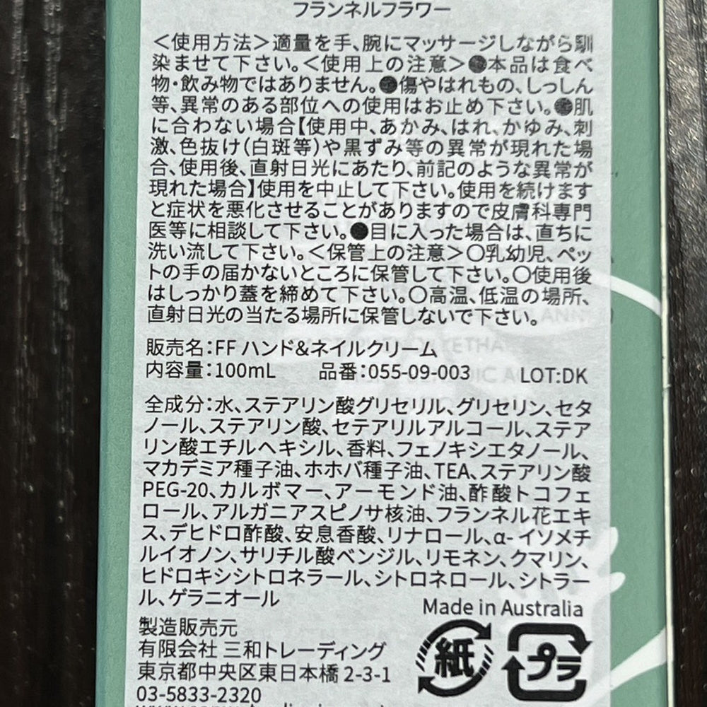 各種オーガニック認定成分を配合したハンド&ネイルクリームです。マカダミアシードオイル、植物由来グリセリン、スウィートアモンドオイル、アルガンカーネルオイル、フランネルフラワーエキス、ホホバオイル配合で手肌の潤いをキープし、爪周りのキューティクル部分のケアにも効果的です。