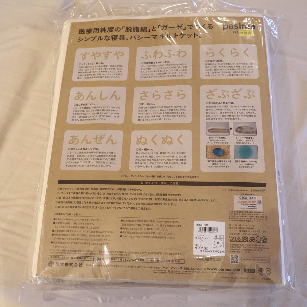 パシーマは自然のもめんを精製して不純物を引き算し余分なものを使用せず製造された商品です。糊やホルマリン、蛍光増白剤、防腐剤、柔軟剤などは一切使用しておらず、医療用純度の脱脂綿とガーゼで作られたシンプルな寝具です。安全基準であるエコテックス規格100で最高クラスである「クラスⅠ」に認証されています。やさしい使い心地で赤ちゃんにも安心です。