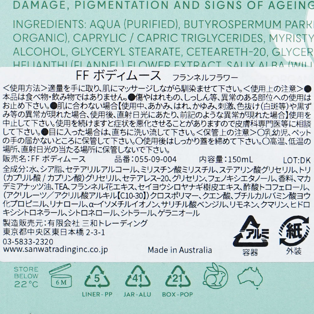 シアバター、植物由来グリセリン、フランネルフラワーエキス、ウィローバーク(ヤナギ樹皮)エキス、マカダミアシードオイル配合。特にシアバターは 15%も配合されており、濃密な保湿をお約束します。泡立てたホイップクリームのように軽い使い心地なのに、濃厚な潤いで肌を艶やかに保ちます。