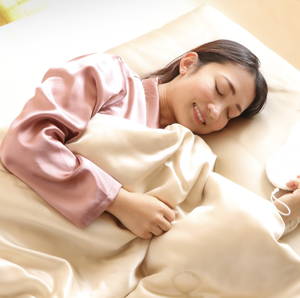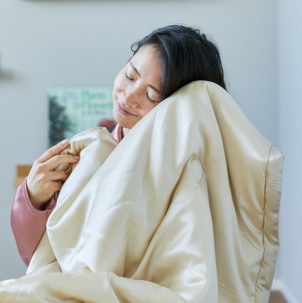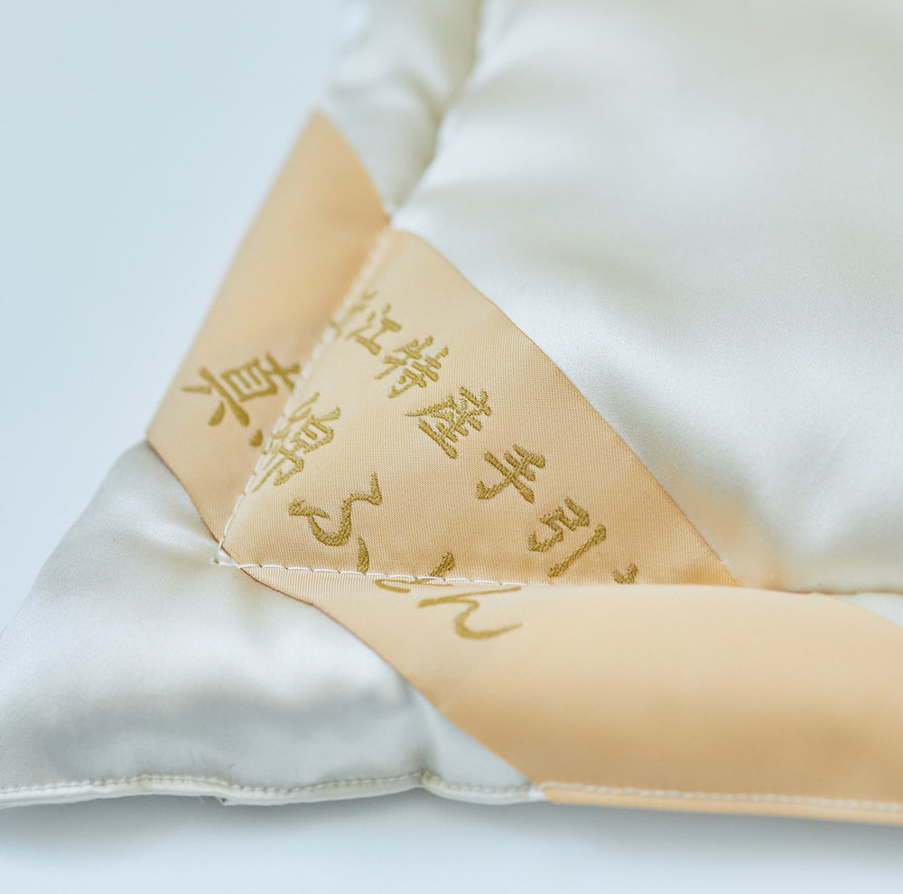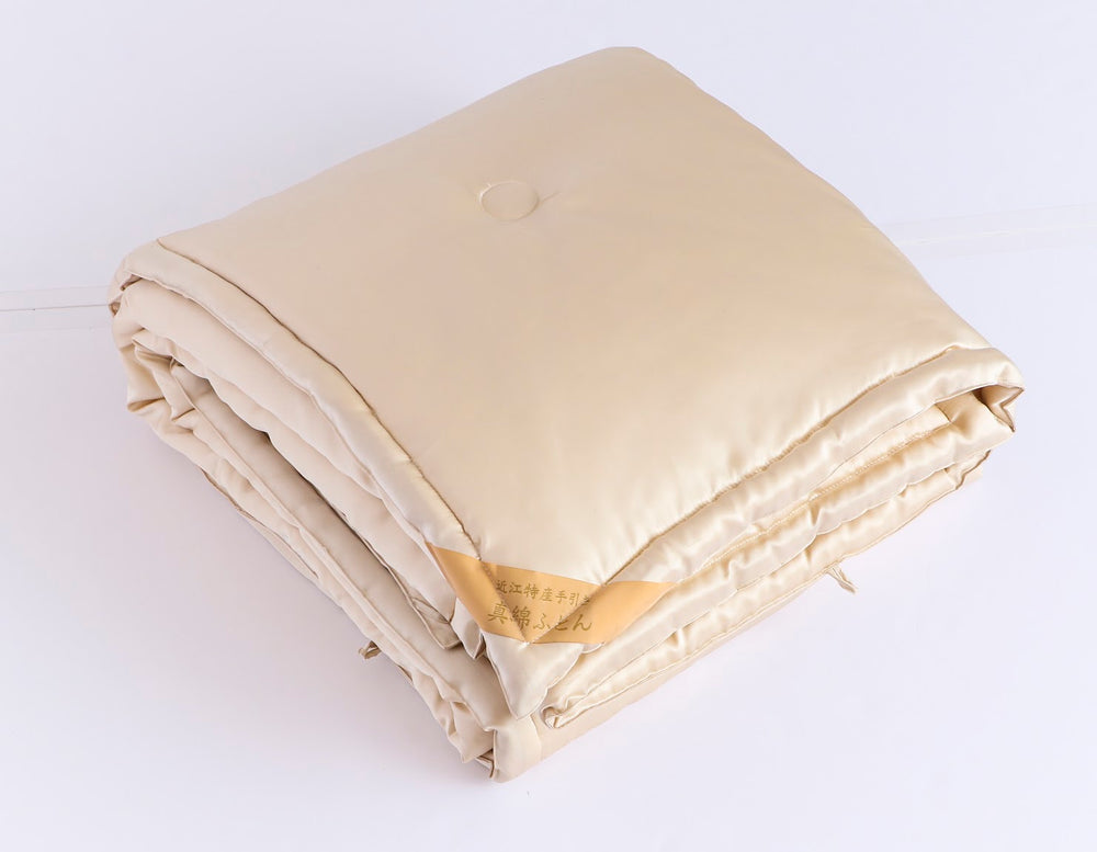 真綿布団は絹100%の手作りのお布団です。シルク発祥の地、中国から輸入した角真綿を使用した真綿布団です。 繭をわた状に引き伸ばしたものを角真綿といいます。それを手作業で何層にも重ねて作ります。繊維の間に空気をよく含み保温性にすぐれています。