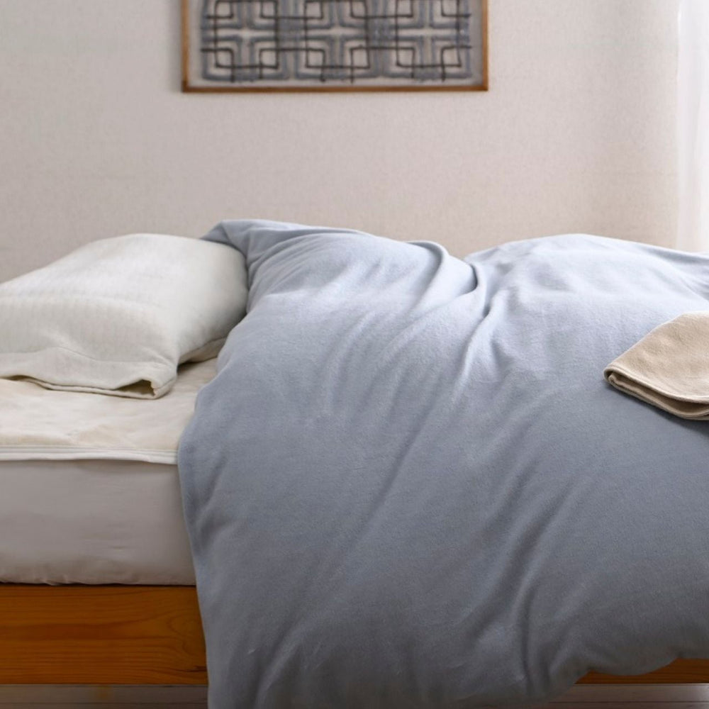 肌に触れる部分は綿100%、ムレにくく通気性が抜群です。両面柔らかい起毛素材でふとんに入った時のヒヤッと感がありません。シングルサイズで約900gとカバー自体が軽いので、中の羽毛ふとんの軽さも損なわず快適な寝心地。寒い季節に大変人気のある掛けふとんカバーです。