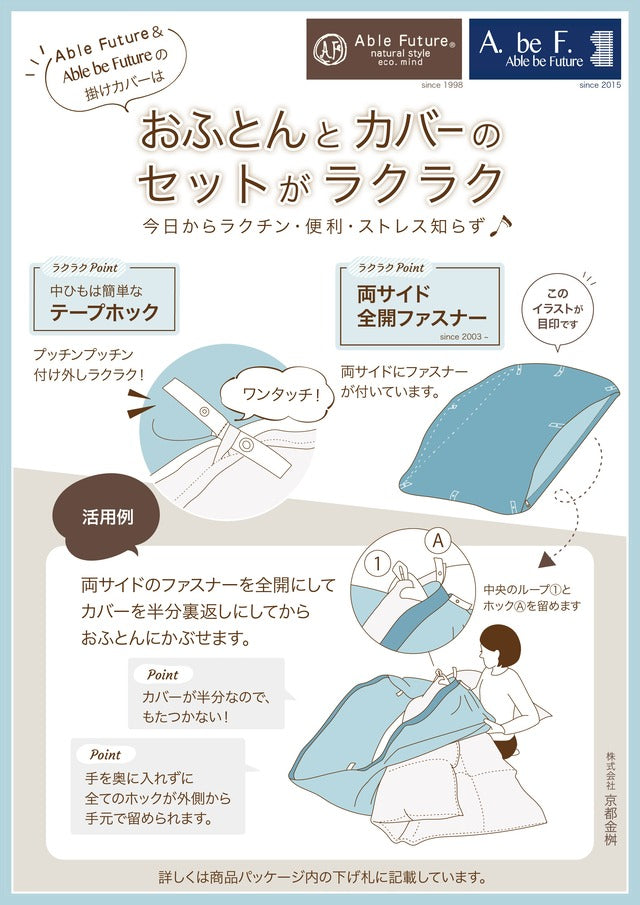 京都の羽毛ふとん製造卸の老舗「京都金桝」のプライベートブランド『Able Future』のふんわり軽くて暖かいタオルカバーです。