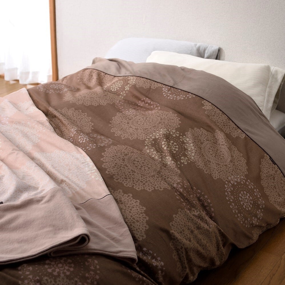 肌に触れる部分は綿100%でムレにくく通気性が抜群。裏地と襟元は柔らかい起毛素材なのでふとんに入った時にヒヤッと感がありません。表側は華やかなレース柄デザインのサテン生地。シングルサイズで約900gとカバー自体が軽く、中の羽毛ふとんの軽さも損なわず快適な寝心地です。寒い季節に大変人気のある掛けふとんカバーです。