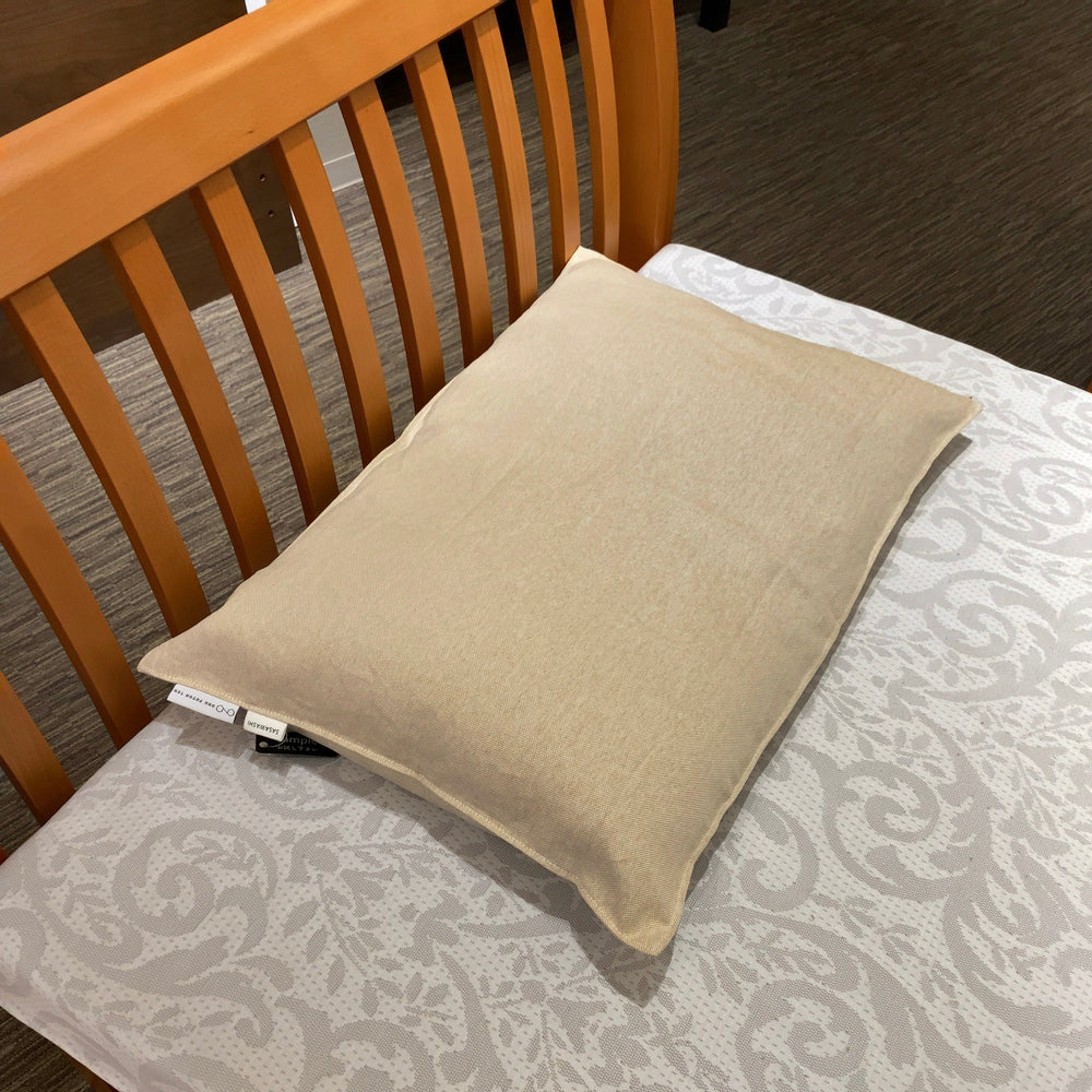 くまざさと和紙から作った、肌に優しい衣類や寝具などを展開しているライフスタイルブランド「SASAWASHI(ササワシ)」。当店のお客様もファンの多い「SASAWASHI(ササワシ)」と一緒に「FIT LABO(西川株式会社)」のオーダーメイド枕にお使いいただける専用のピローケースを作りました。枕を出しやすいゆとりのあるサイズ感です。頭側に目印のタグが付いています。色はササワシらしいナチュラルなベージュとグレーの2色からお選びいただけます。