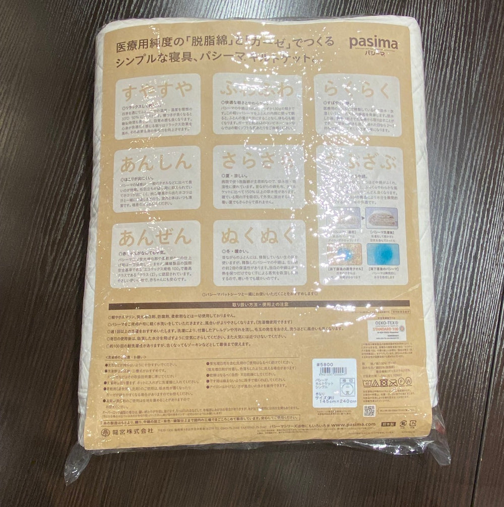 パシーマは自然のもめんを精製して不純物を引き算し余分なものを使用せず製造された商品です。糊やホルマリン、蛍光増白剤、防腐剤、柔軟剤などは一切使用しておらず、医療用純度の脱脂綿とガーゼで作られたシンプルな寝具です。安全基準であるエコテックス規格100で最高クラスである「クラスⅠ」に認証されています。やさしい使い心地で赤ちゃんにも安心です。