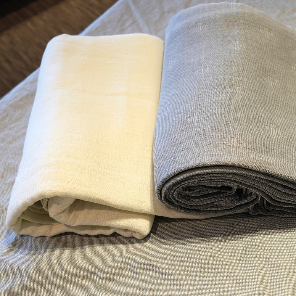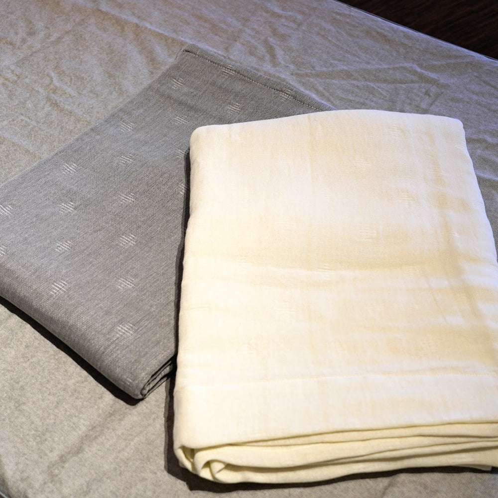 毛羽を取った綿糸とササワシで織りあげた、吸湿性や通気性に優れたケットです。