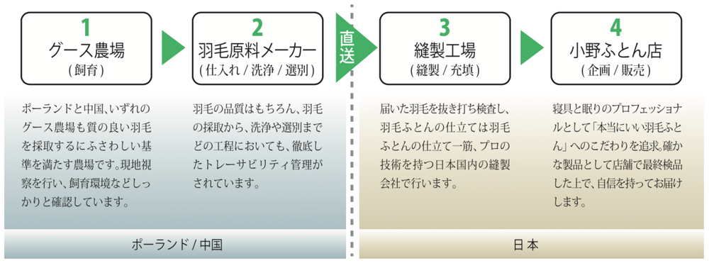一枚の羽毛ふとんができあがるまでには、さまざまな素材や原料を扱い、さまざまな人の手や工程を経る必要があります。