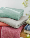 綿毛布は1年中使うことができ、吸水性吸湿性に優れています。特に、IBENA社の綿毛布は他社の綿毛布よりも軽量で、なめらかな肌触りが特徴です。羽毛ふとんとの相性が良く、羽毛ふとんの内側に使用していただくことで、真冬でもより暖かくご使用いただけますし、春や秋の温度調整が難しい季節には1枚あると重宝します。