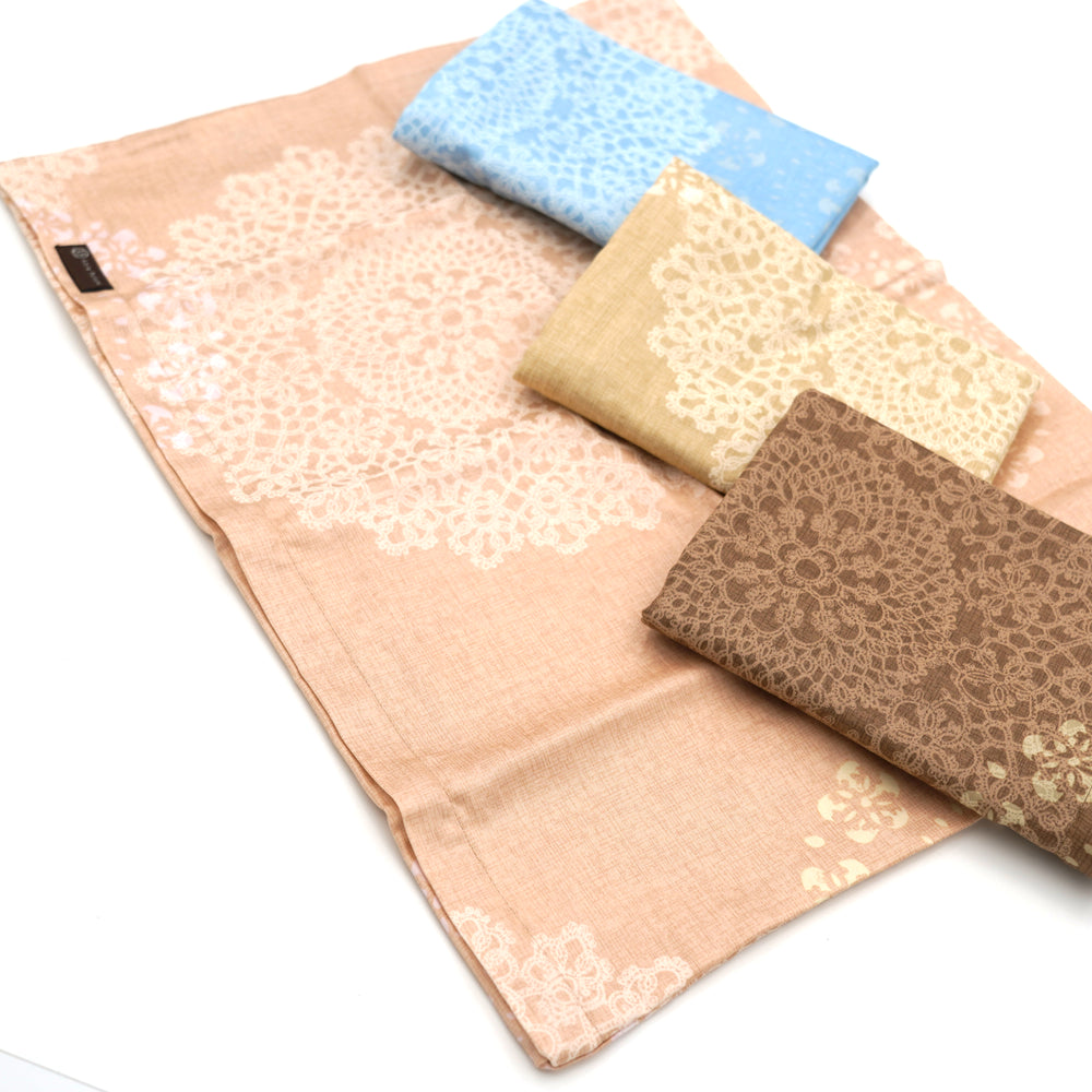 繊細で華やかなレース柄を全体に散りばめたデザイン。綿100%のサテン生地は、柔らかい光沢とソフト加工を施したしっとりなめらかな感触が特徴です。もちろんお家でお洗濯もしていただけます。