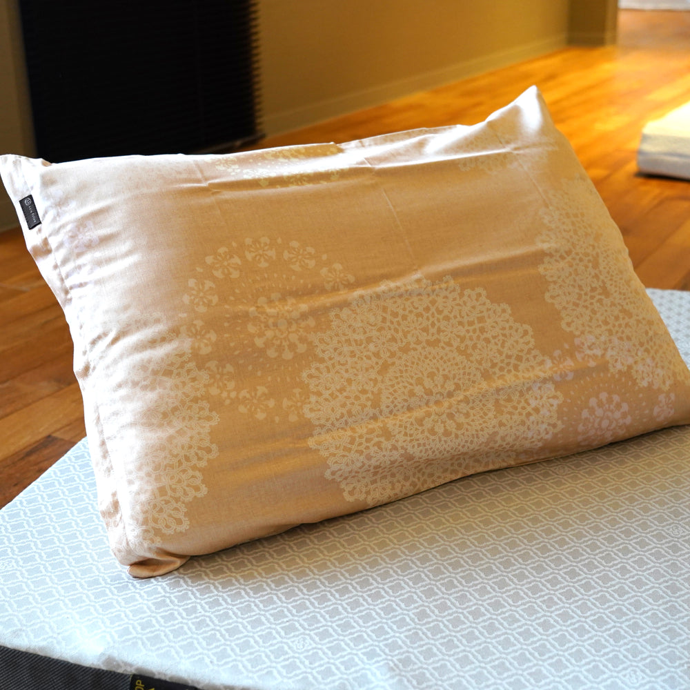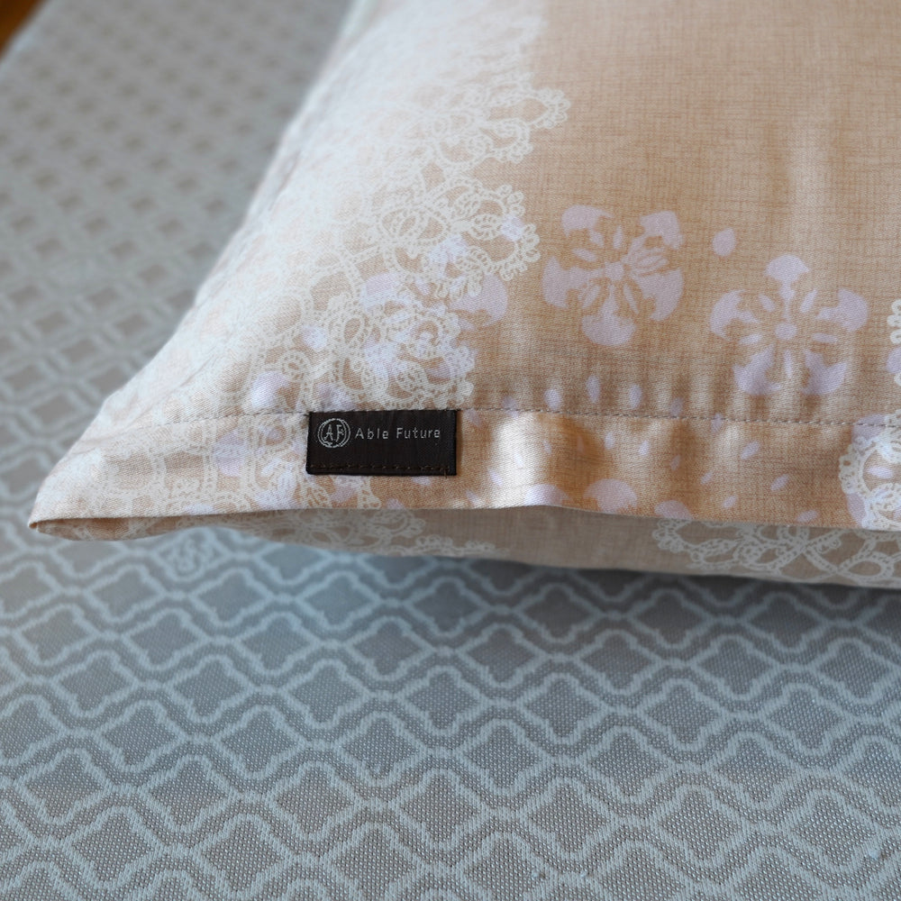 京都にある老舗羽毛ふとん製造卸「京都金桝」。「京都金桝」のプライベートブランドである『Able Future』のロングセラーシリーズ「クロッシェ」のファスナー式ピロケースです。