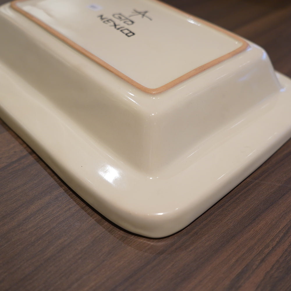 こちらは、少し大きめの長方形型のボウルです。大きさは縦約20cm、横が約28.5cmで、高さが約5.5cmになります。厚みのあるしっかりした陶器です。