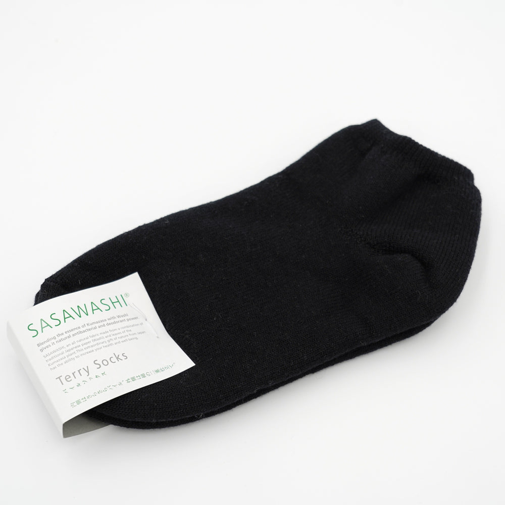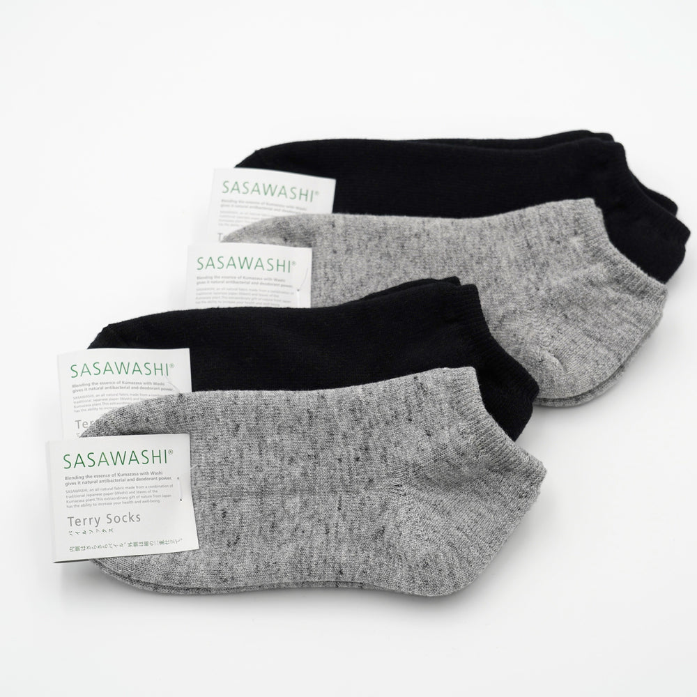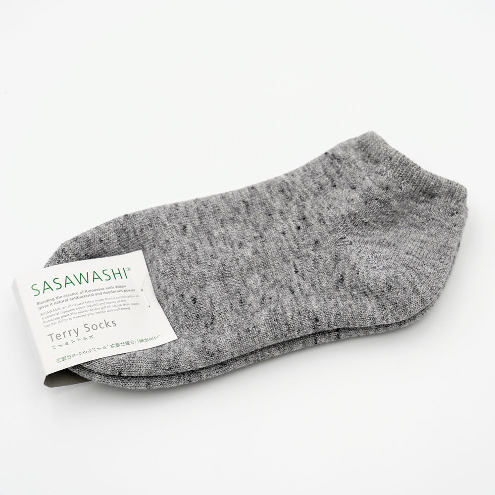 肌に当たる内側に吸水性の高いササワシパイルが使われています。ムレや汗によるべとつきがなく、菌の繁殖を抑えて、いつも清潔でにおいが気になりません。2層構造で厚手の生地のため、スポーツやウォーキングにオススメです。靴の中は一番環境が悪いところです。だからこそ、靴下の素材の性能差がハッキリと分かります。また、ササワシ靴下シリーズをご使用いただく事で足裏の角質が自然にとれてすべすべになります。