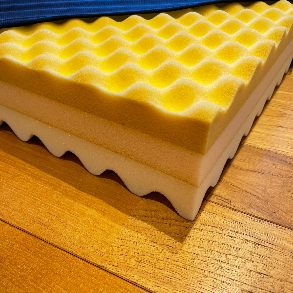 表と裏とどちらでも中層のベースがあり、全て合わせると3層構造になっております。3種類の硬さや機能が違うウレタンを使用することで、硬さだけでなく反発力としっかりとした密度があります。適度な反発力で寝返りもしやすい。上下の層が「ポコポコ」になっていることで通常のウレタン敷きふとんより通気性が良く蒸れにくく快適です。