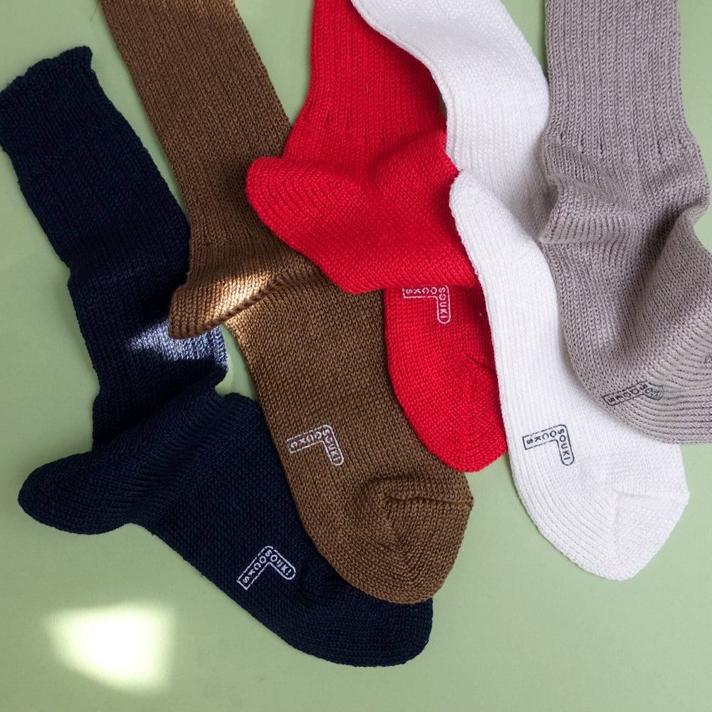 SOUKIが代々受け継いできた稀少なローゲージの編機と技術で、素材の良さを最大限に感じてもらえるくつ下をつくりました。カジュアルソックスのイメージがつよいローゲージのくつ下ではなかなか使われることのなかった高品質の天然素材をたっぷりと贅沢につかい、丁寧にゆっくりと編みあげています。