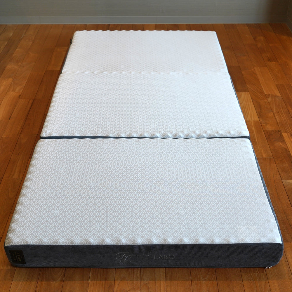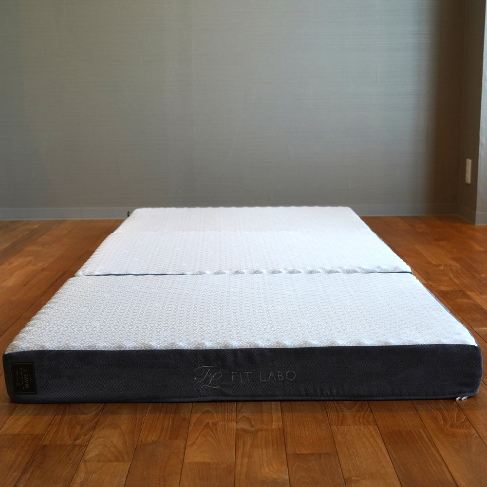 収納や取り扱いがしやすい三つ折りのフロアタイプです。フロアタイプは床に直接敷いてもベッドでもどちらでも使えます。硬さは、体のラインに優しくフィットするやわらかめの「レギュラー」としっかりとした寝心地の「ハード」2種類からお選びいただけます。